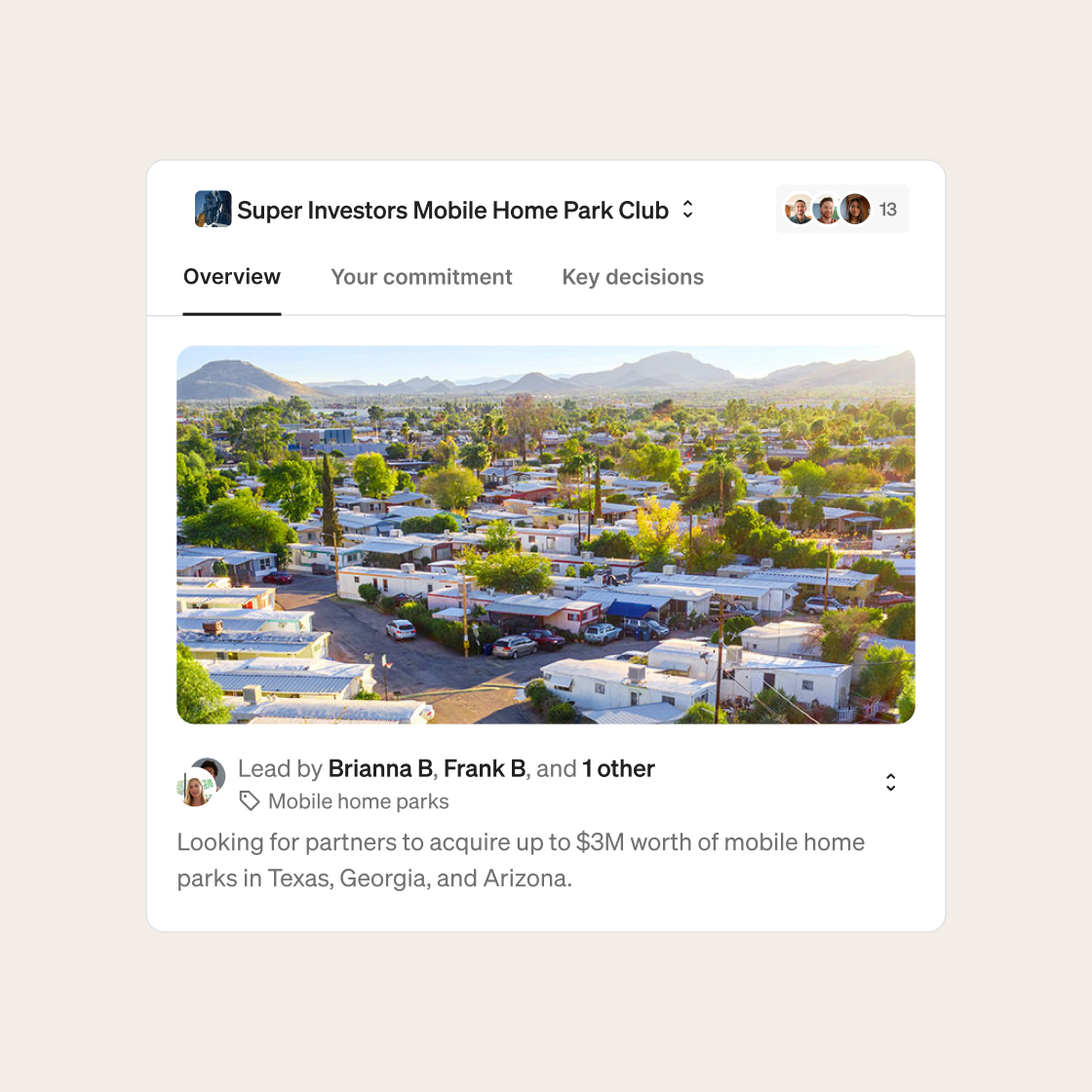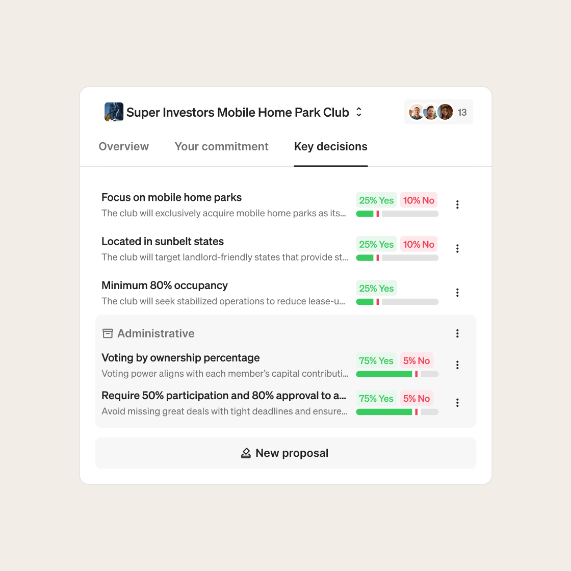 Investment clubs on Fractional let you operate efficiently as a collective. Skip the cost and red tape of syndications or funds. Pool resources with your friends, network, or audience. No middlemen. No legal headaches.